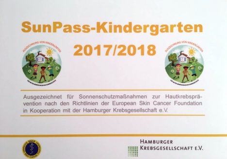 Für Sonnenschutzmaßnahmen zur Hautkrebsprävention haben wir am 30.08.2017 zum vierten Mal die Auszeichnung „Sun Pass Kindergarten“ erhalten. Unsere Eltern werden täglich über den aktuellen UV-Index, Sonnenschutzmaßnahmen und passende Bilderbücher zum Thema Sonnenschutz…