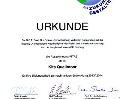 Am 11.09.2014 hat unser Kindergarten erneut die Auszeichnung "KITA21" für die Bildungsarbeit zur nachhaltigen Entwicklung erhalten. Die Auszeichnung KITA21 wird von der Umweltstiftung "S.O.F. - Save Our Future" in Kooperation mit der Initiative…15/09/2014Sun Pass – Gesunder Sonnenspaß für Kinder